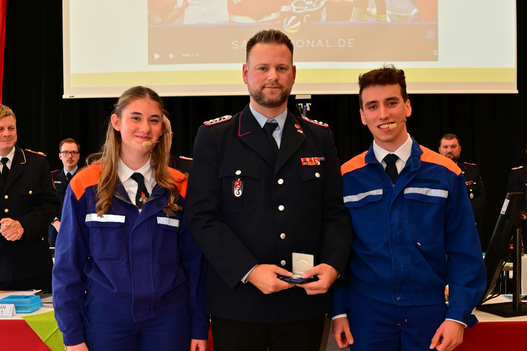 Nach langjährigem Engagement wurden die folgenden Personen verabschiedet und erhielten als Dankeschön eine Auszeichnung: Die Bronze-Medaille erhielten Pascal Bründermann, stellvertretender Bezirks- Kinder- und Jugendfeuerwehrwart Weser-Ems, sowie Landes-Jugendsprecherin Neele Gillerke.