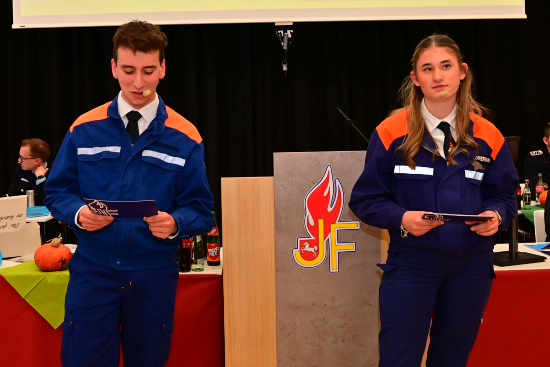 Die Landes-Jugendsprecherin Merle und ihr Stellvertreter Niklas freuten sich besonders darüber, so viele junge Delegierte begrüßen zu können, als sie um 14.15 Uhr als Moderatoren-Duo die Versammlung eröffneten. Es war die erste Delegiertenversammlung nach der neuen Satzung – mit mehr Jugendbeteiligung und neuem Namen. Denn als erster Jugendfeuerwehr-Landesverband in Deutschland nennt die N(K)JF seit Anfang des Jahres auch die Kinderfeuerwehren im Vereinsnamen sowie entsprechender Funktionsbezeichnungen. Damit soll die Gleichstellung der Kinderfeuerwehr gegenüber den Jugendfeuerwehren unterstrichen werden.