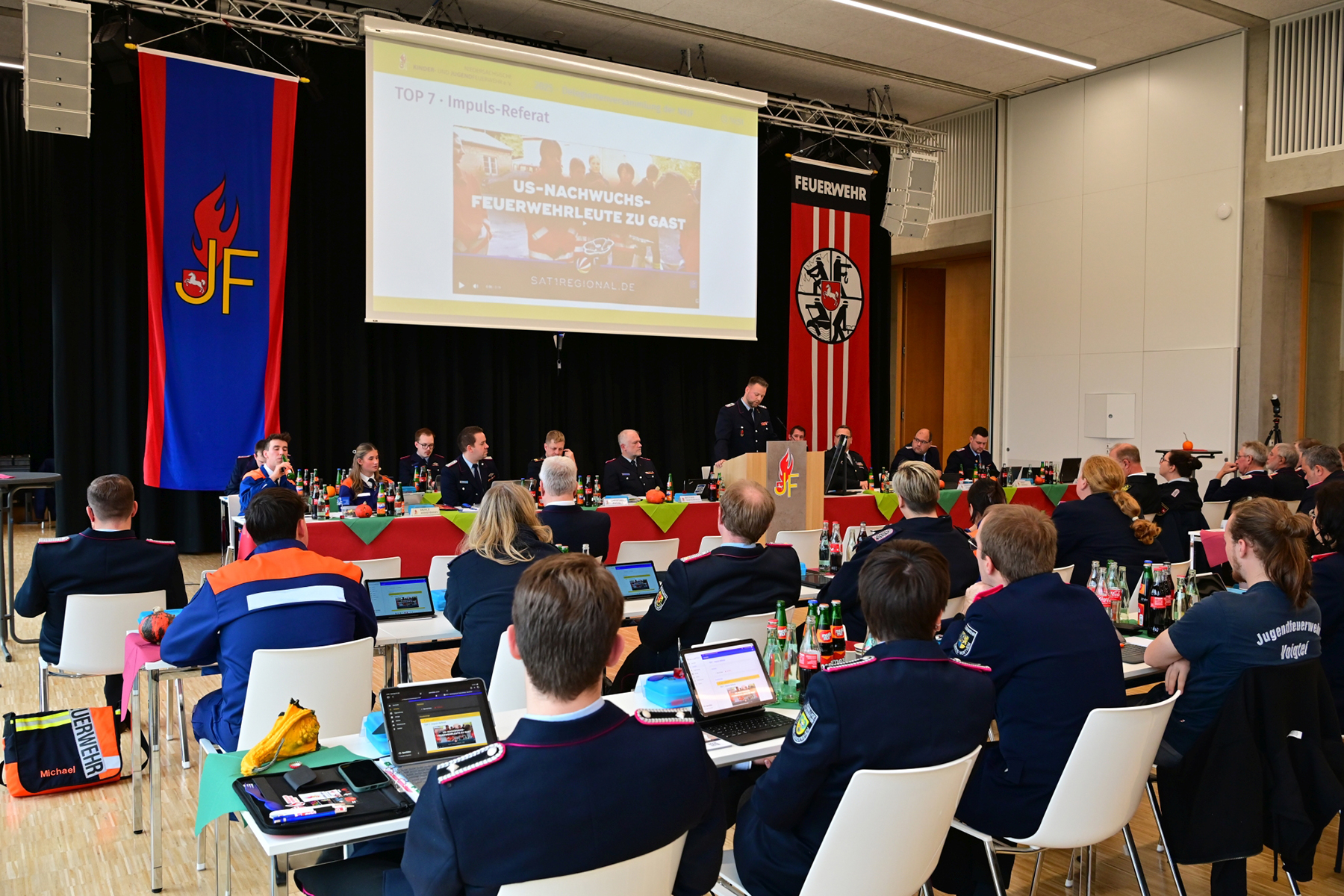 Die Versammlung lauscht dem Impulsvortrag von Marcel Kamphenkel zu dem Austauschprogramm mit der Jugendfeuerwehr des Nassau County bei New York.