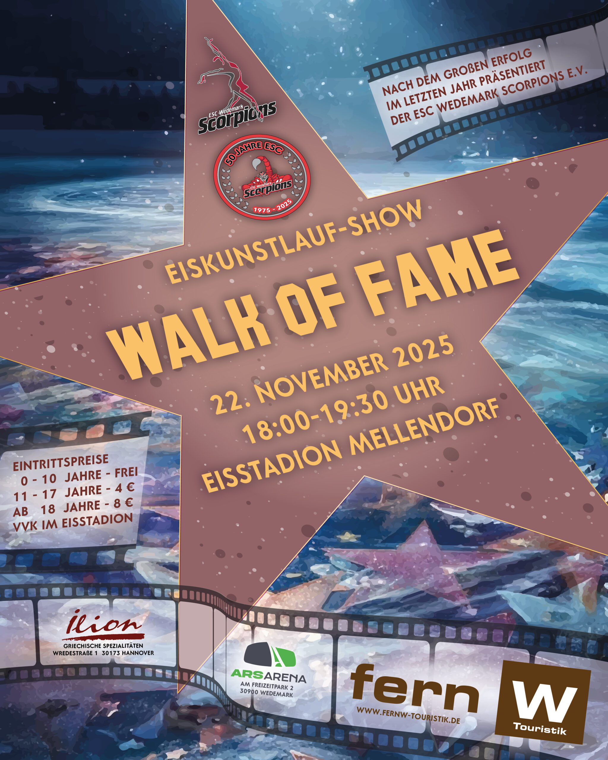 Der ESC Wedemark Scorpions präsentiert am Sonnabend, 22. November 2025, seine große Eisshow unter dem Motto „Walk of Fame“ im Eisstadion – ARS Arena in Mellendorf/Wedemark. Von 18:00 bis 19:30 Uhr erwartet das Publikum eine glanzvolle Mischung aus Eiskunstlauf, Musik, Licht und Emotionen.