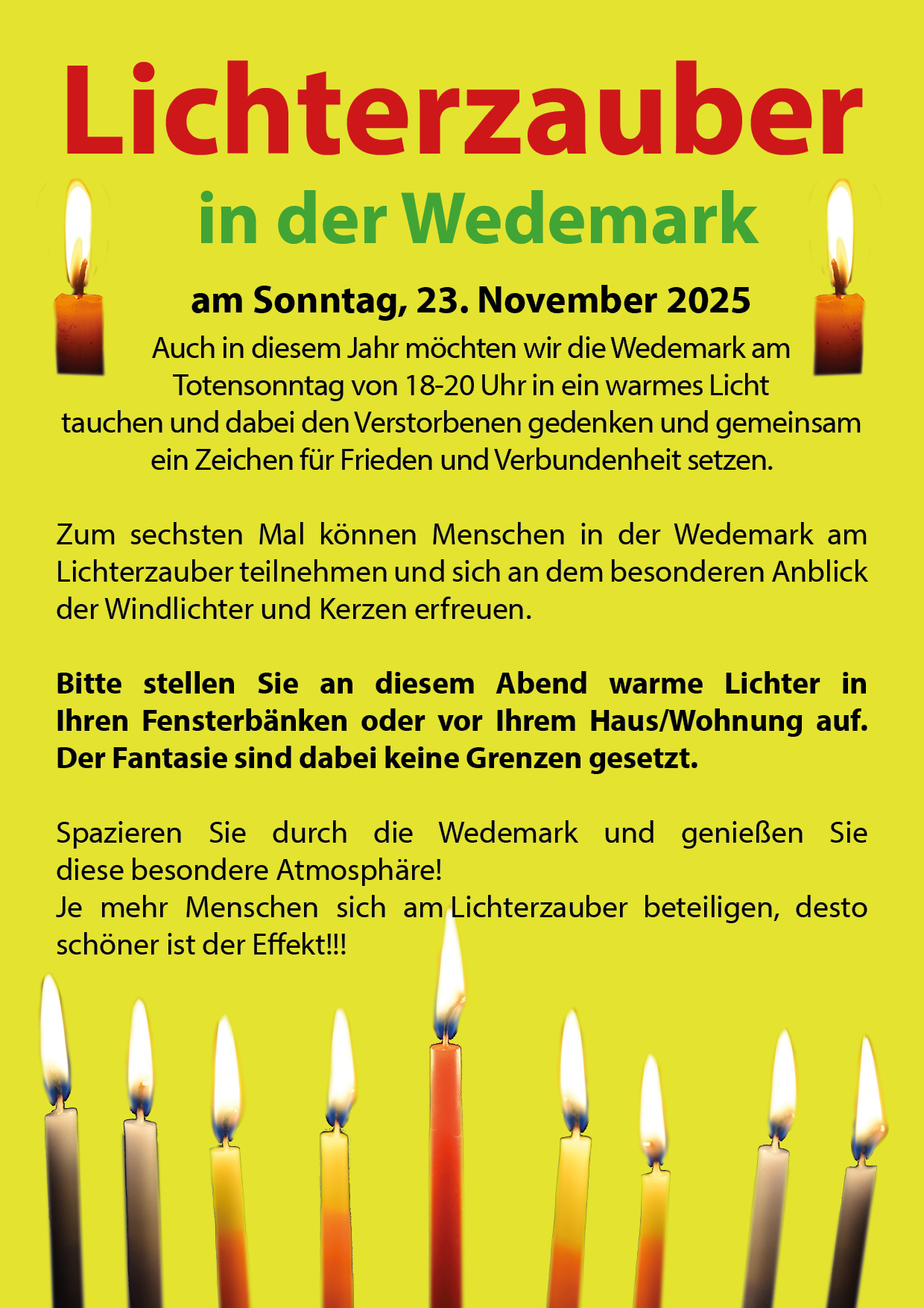 Windlichter, Kerzen und Lampions lassen am 23. November die Wedemark erstrahlen. Die Lichterzauber-Aktion lädt dazu ein, der Verstorbenen zu gedenken und zugleich ein Zeichen für Frieden, Gemeinschaft und Verbundenheit zu setzen – mitten in der Nachbarschaft.