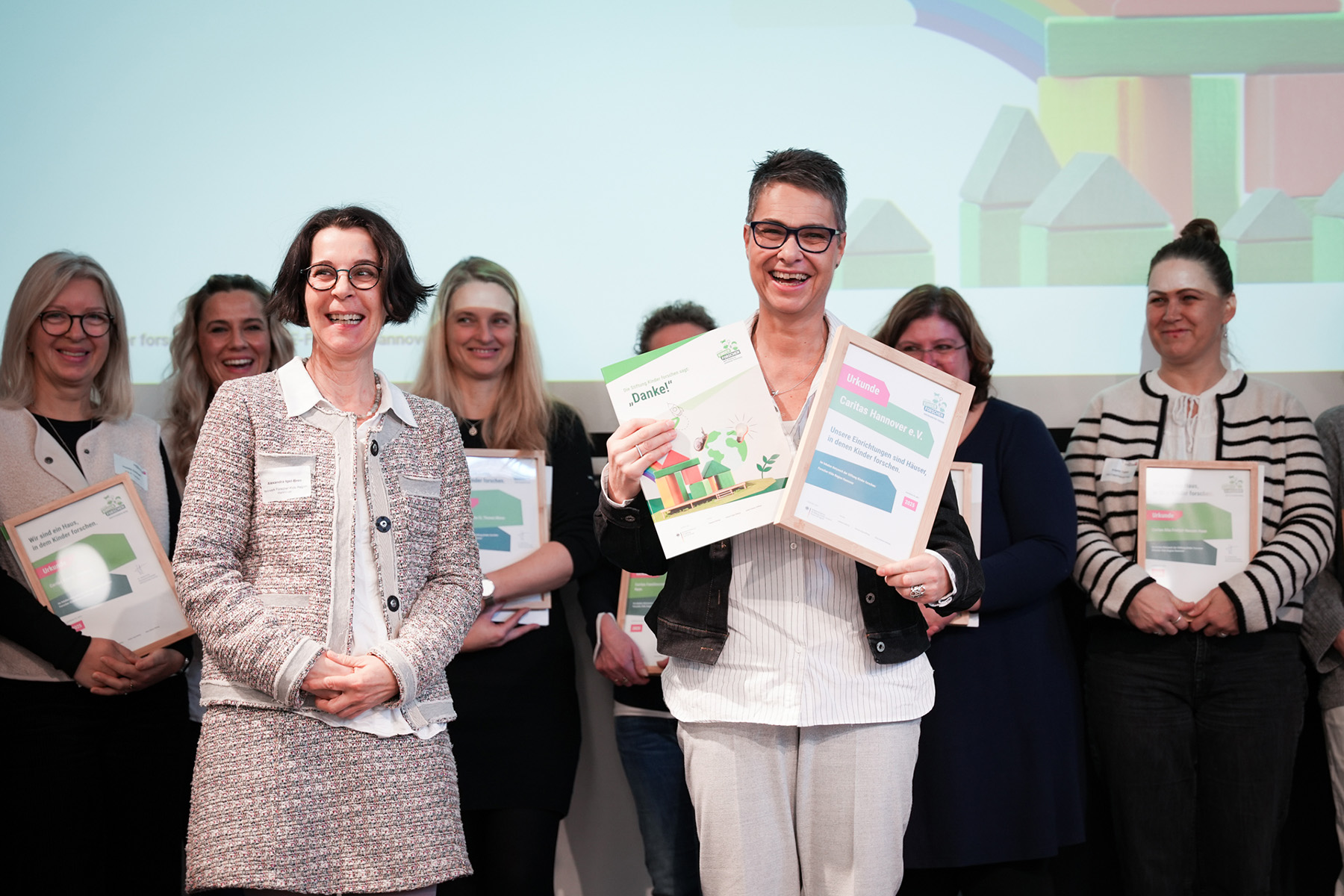Alexandra Igel-Bree von den Forscher-Kids Region Hannover (li.), überreichte die Träger-Auszeichnung an Nicole Wilke, Abteilungsleitung Kinder, Jugend & Familie des Caritasverbandes Hannover e. V. (r.). Alle 20 Einrichtungen des Caritasverbands Hannover erhielten auf dem Fachtag "Tür auf – Bildung für nachhaltige Entwicklung in unseren Kitas und Familienzentren verankern" die Zertifizierung als "Haus, in dem Kinder forschen". Zugleich wurde der Caritasverband Hannover als erster Träger in ganz Deutschland offiziell von der Stiftung Kinder forschen ausgezeichnet.