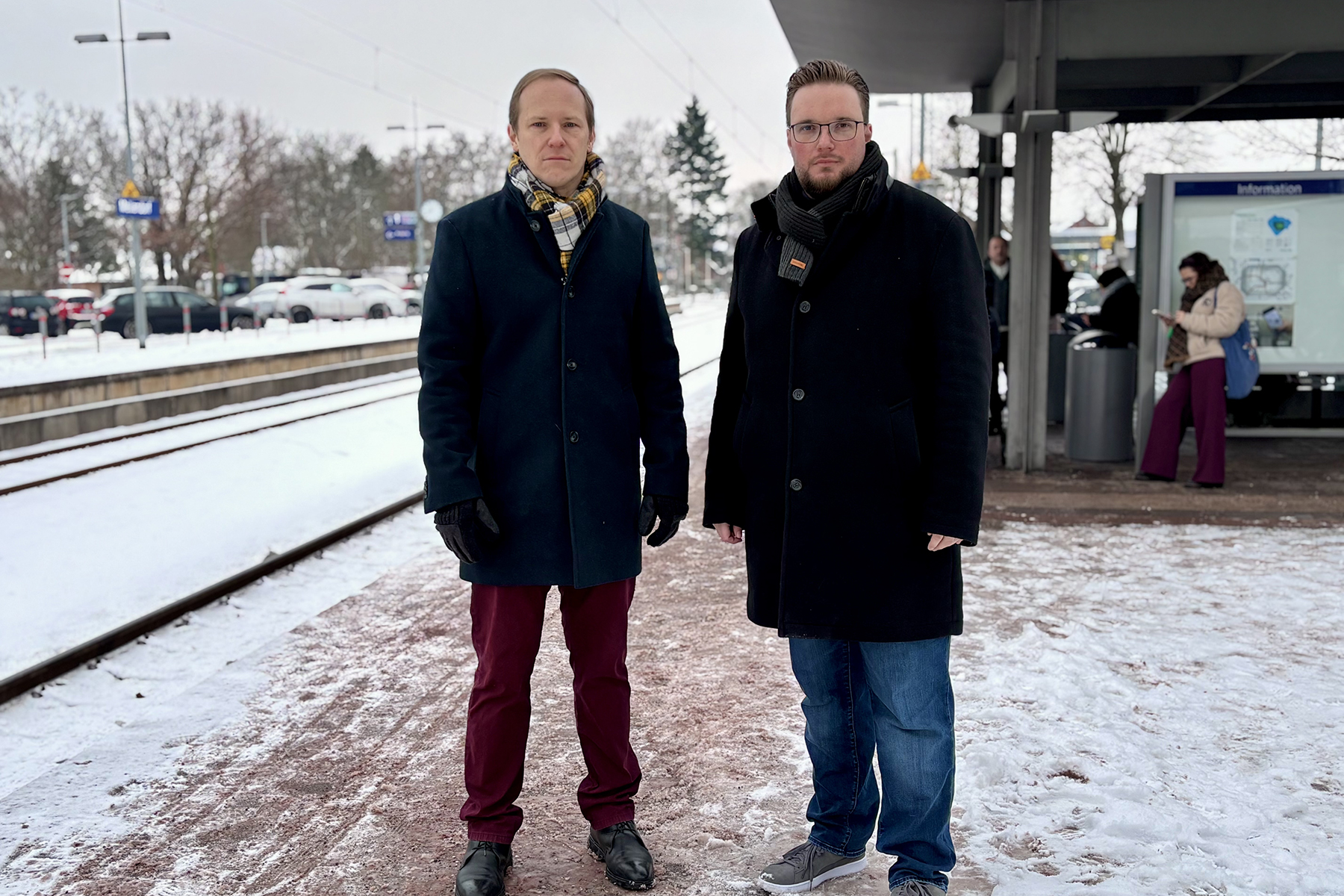 Wedemarks Bürgermeisterkandidat Florian Lübeck und der Vorsitzende der SPD-Fraktion im Rat der Gemeinde Wedemark, Jean Schramke, kritisieren den Betreiber Transdev